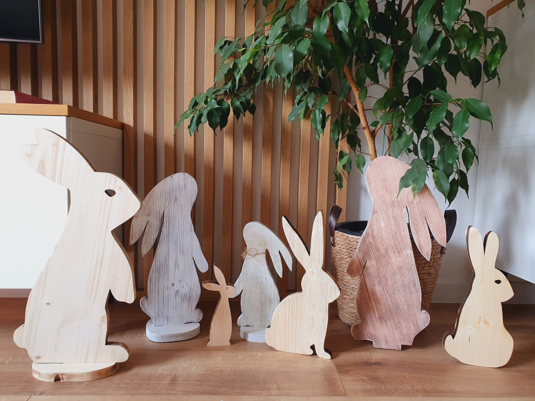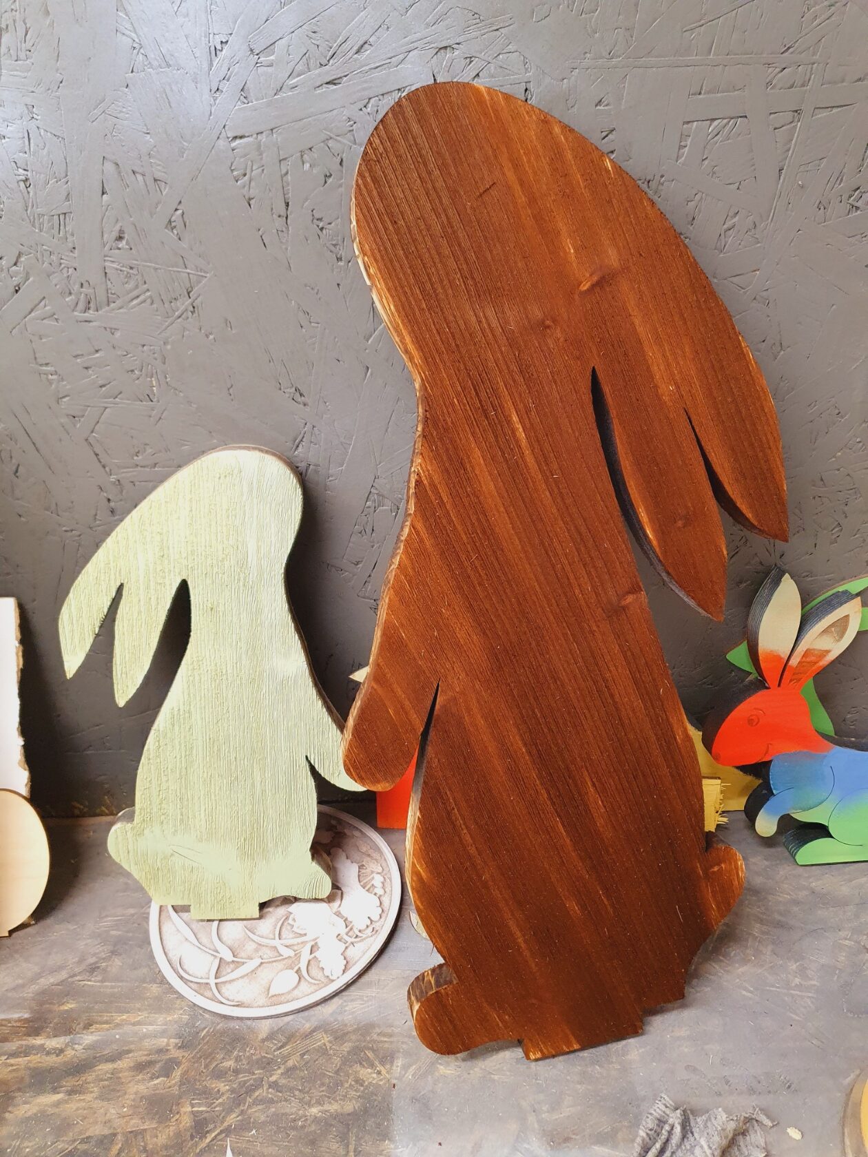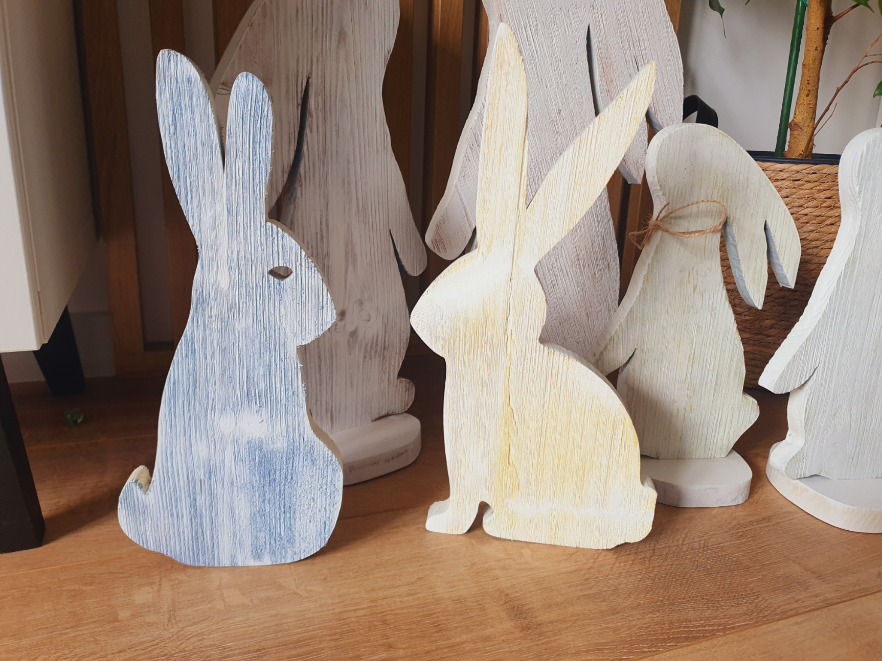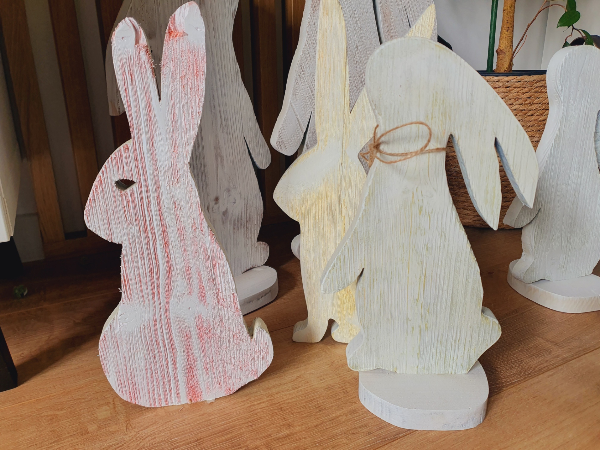 Piękne zające wykonane z deski świerkowej, szczotkowane i malowane.